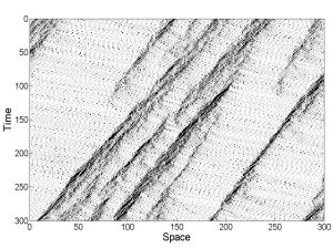 The image on the left is our two-lane traffic model. Traffic jams, which are large clusters of black, propogate backwards on roads as time progress. Cars accelerate quickly upon leaving the jam ad don't slow down until they reach another jam.